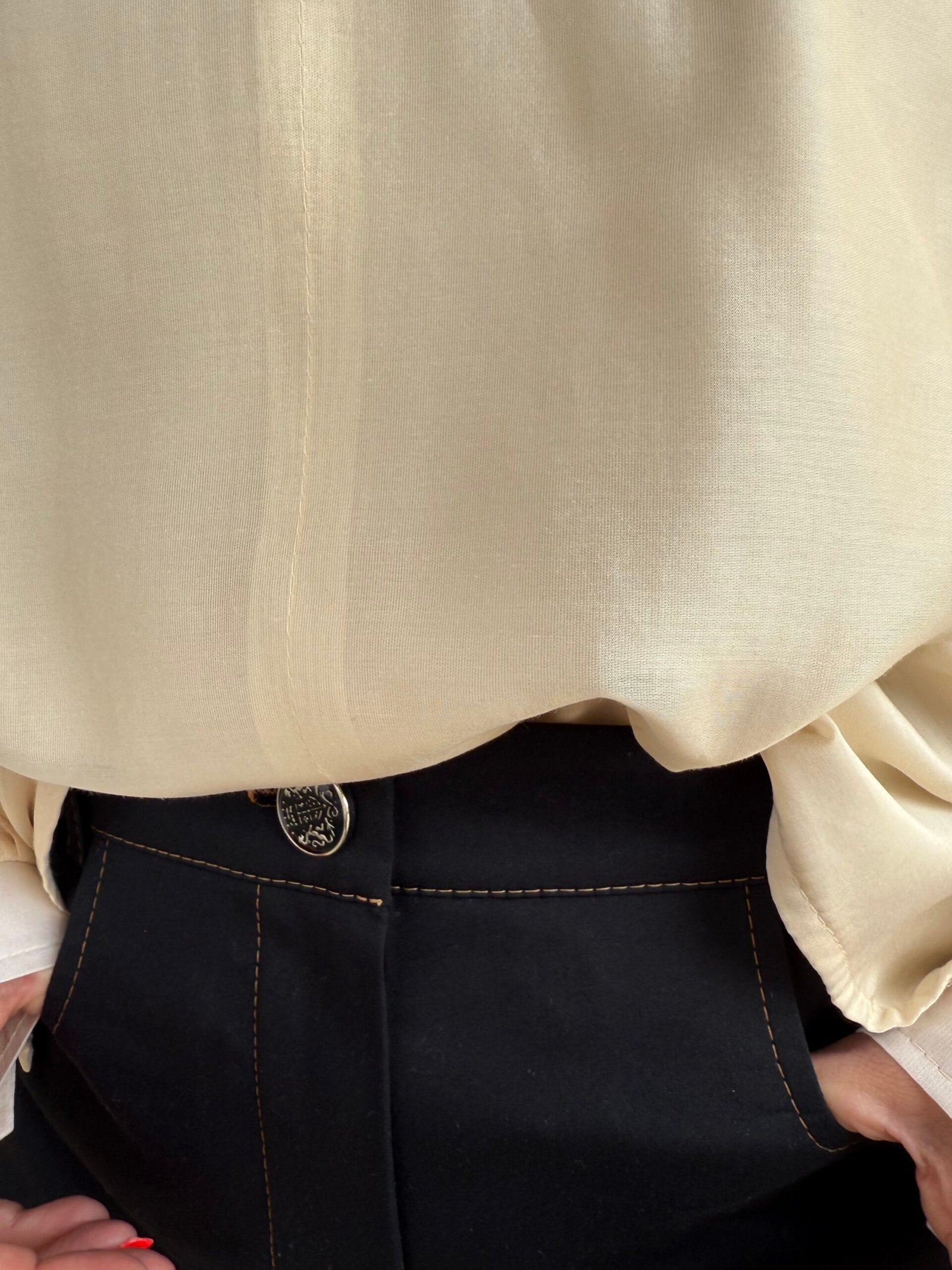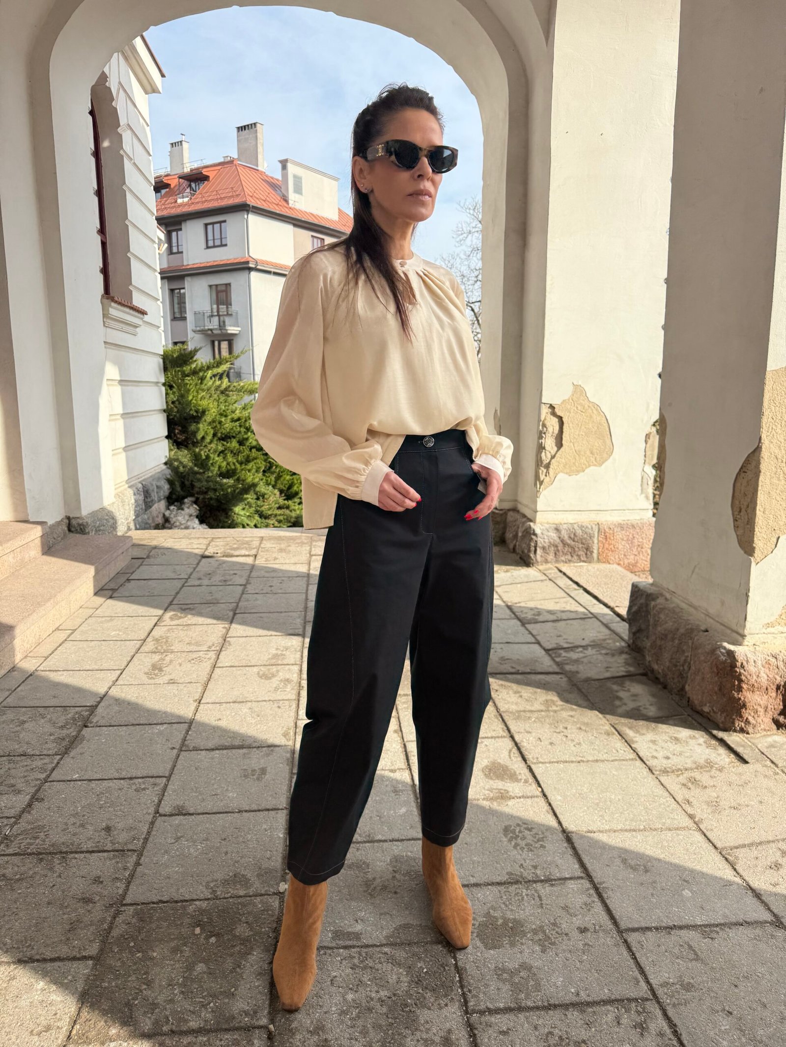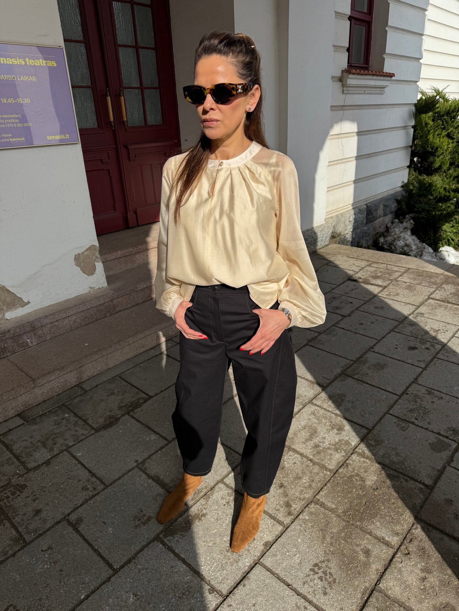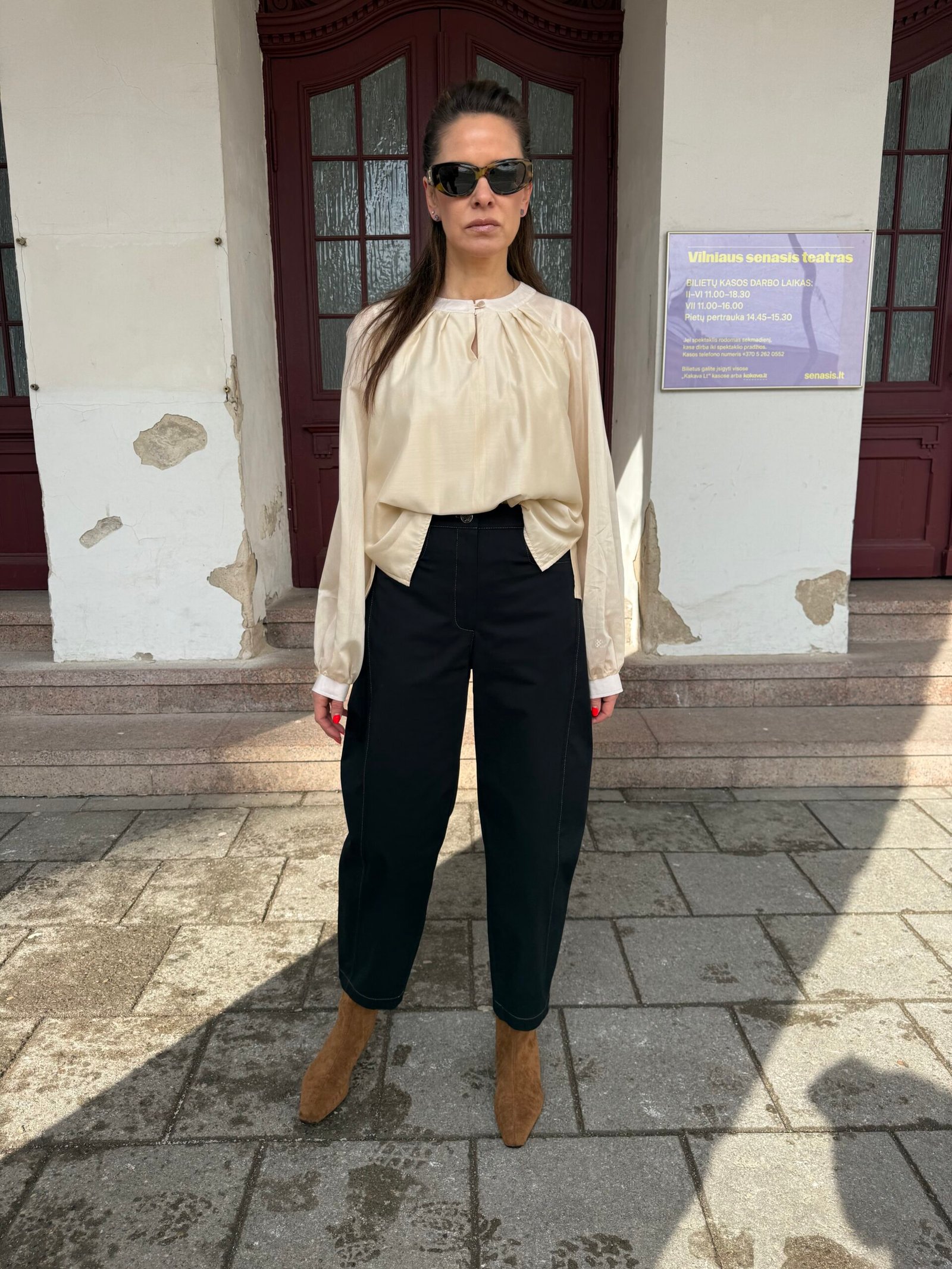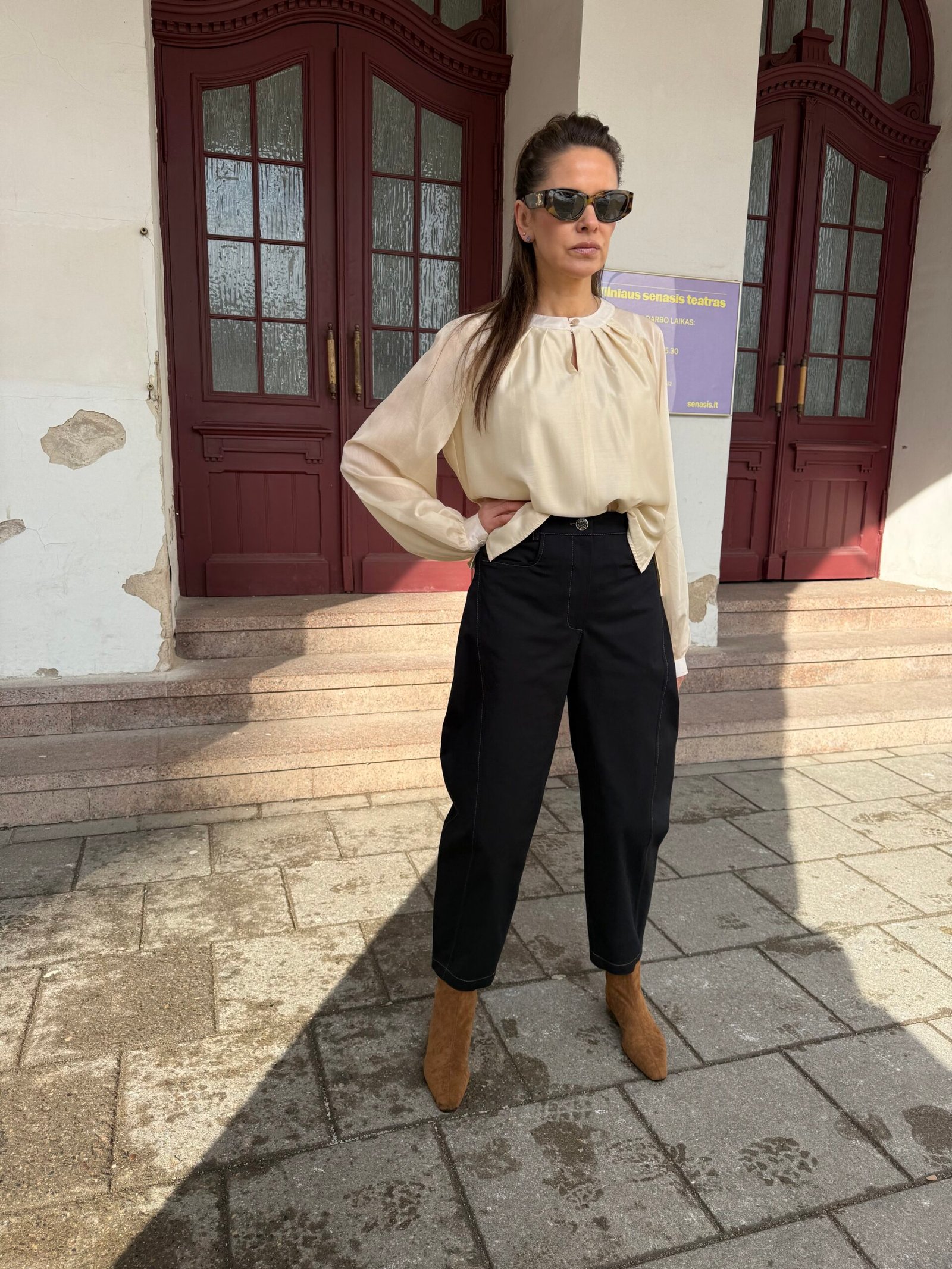 Juodi džinsai su subtiliai prasiūtu rudu siūlu, suteikia lengvo „vintage” charakterio ir išskirtinumo. Balloon forma gražiai formuoja siluetą, suteikia modernumo ir kartu išlaiko patogumą.