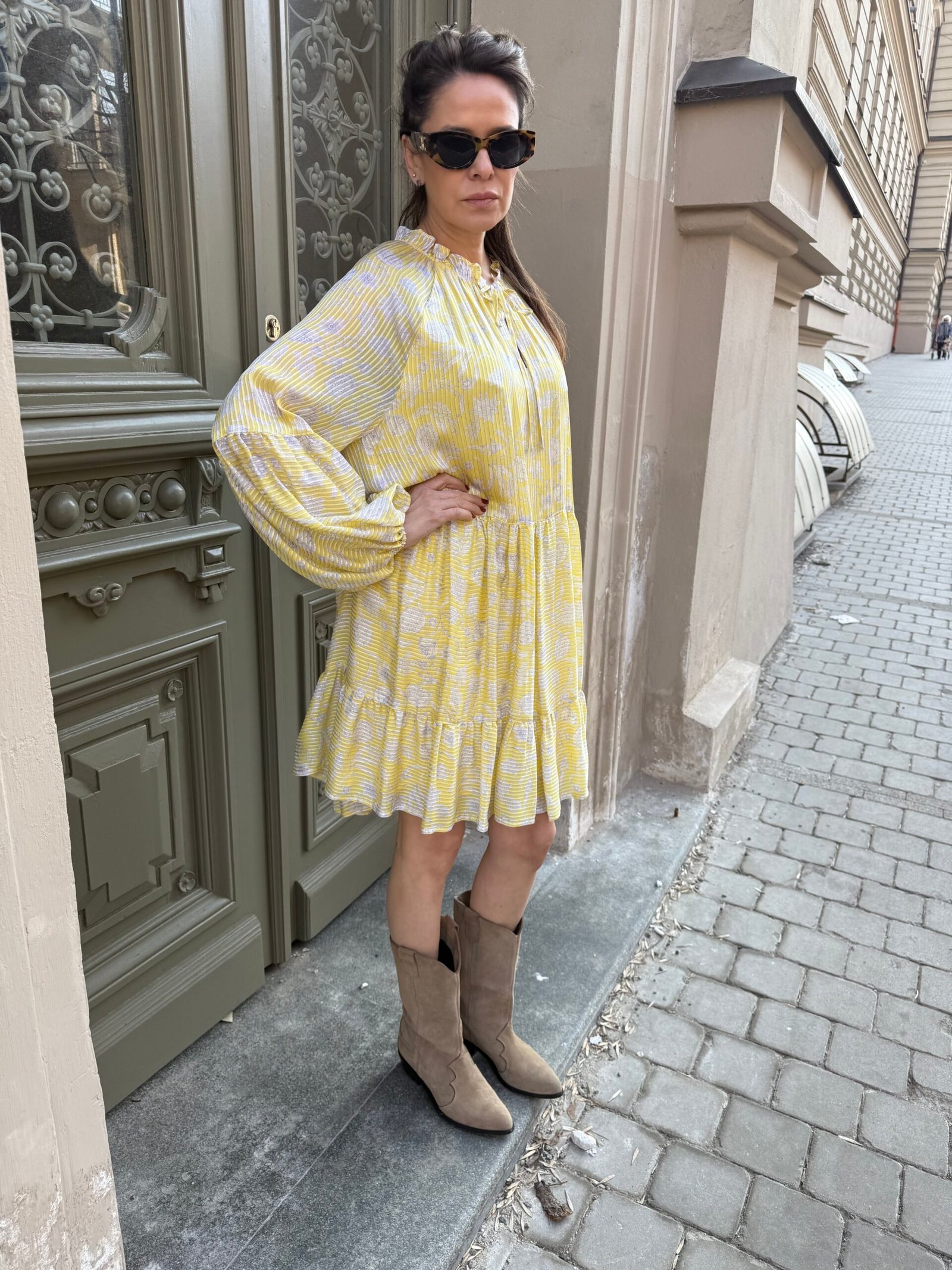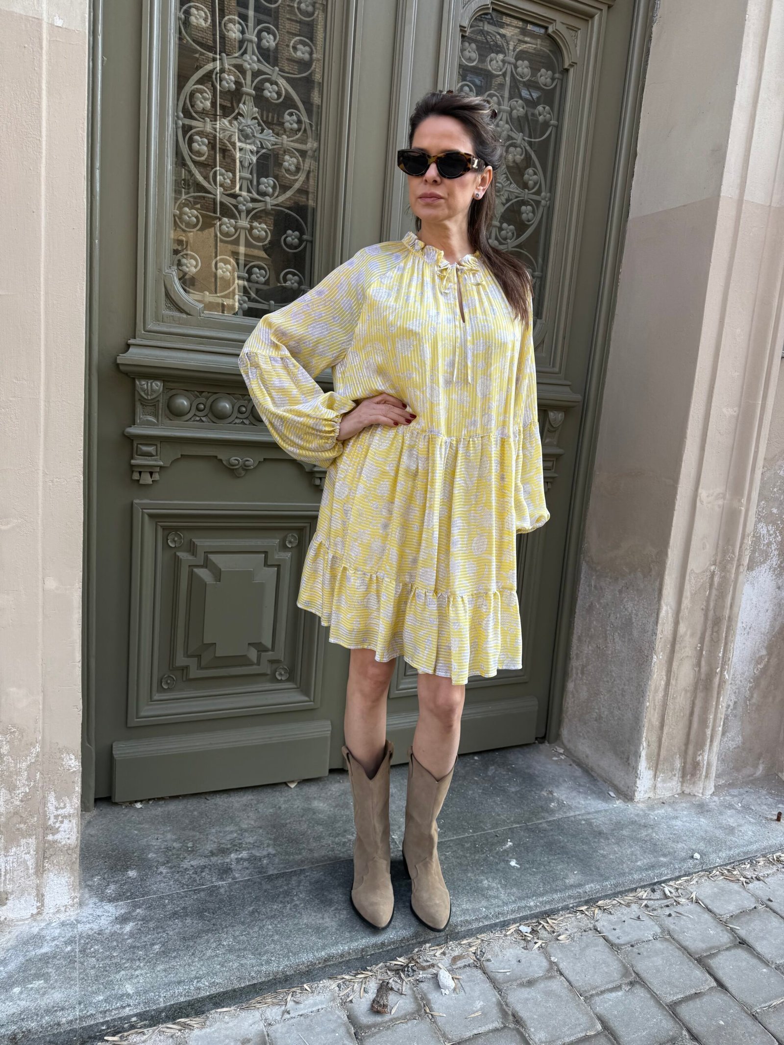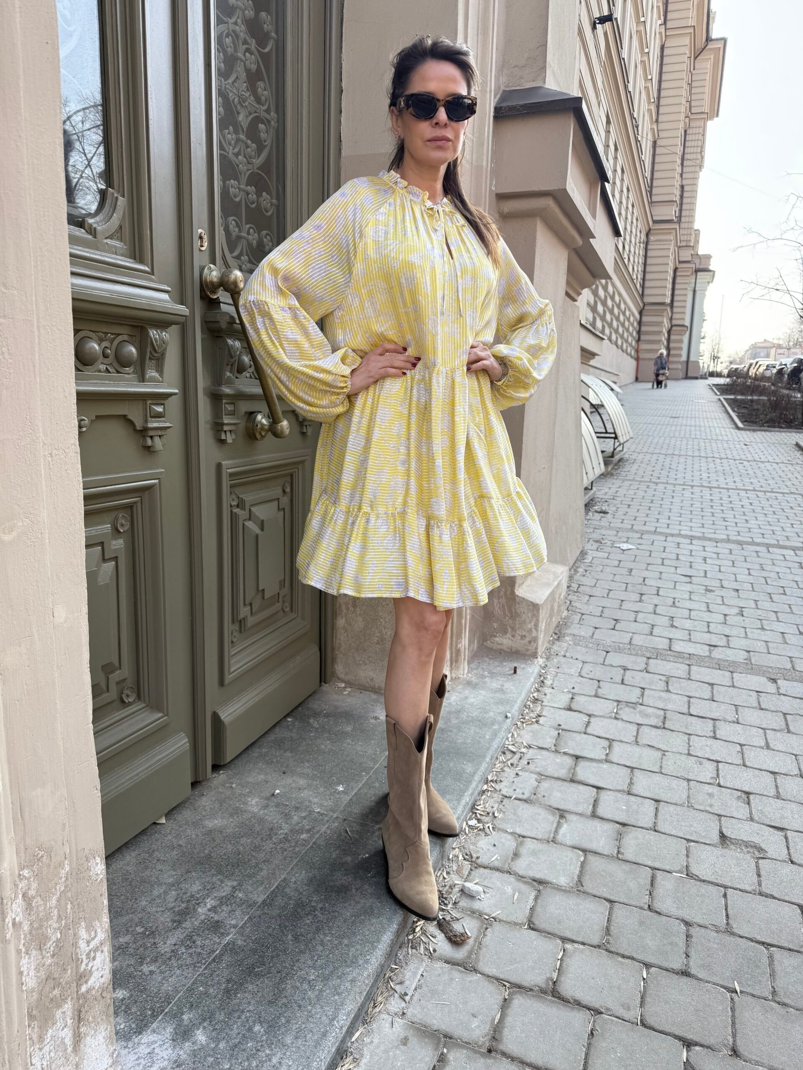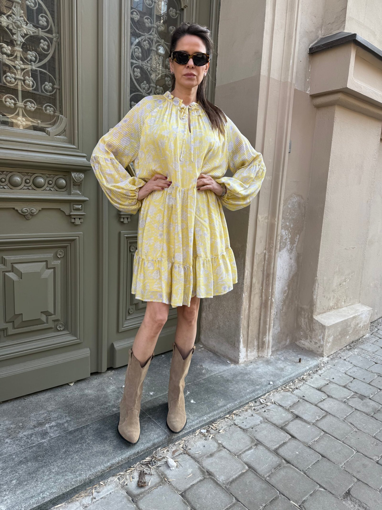 Nuostabi šilko ir viskozės suknelė su pamušalu. Švelnios, geltonos spalvos – spindinti, bet subtili. Ilgomis rankovėmis, krentanti lengvai ir moteriškai.