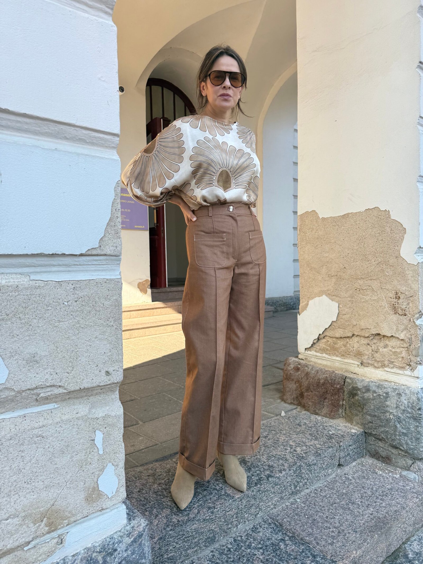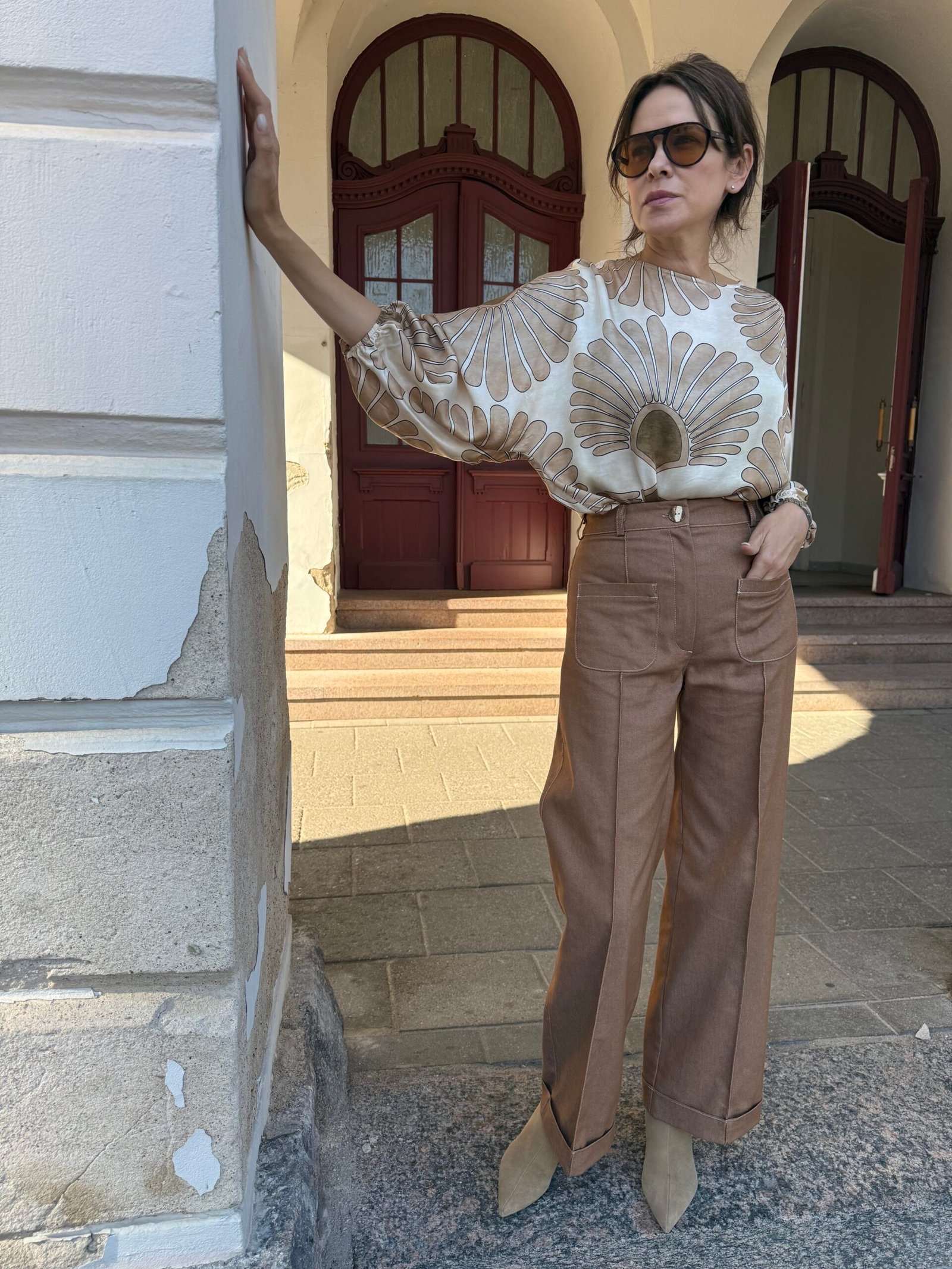 Elegantiška ir subtili – ši šilko palaidinė alsuoja lengvumu ir rafinuotumu. Natūralus šilkas švelniai priglunda prie odos, gražiai krenta ir suteikia komforto pojūtį kiekviename judesyje. Puikiai dera tiek prie camel, tiek prie baltų džinsų.
