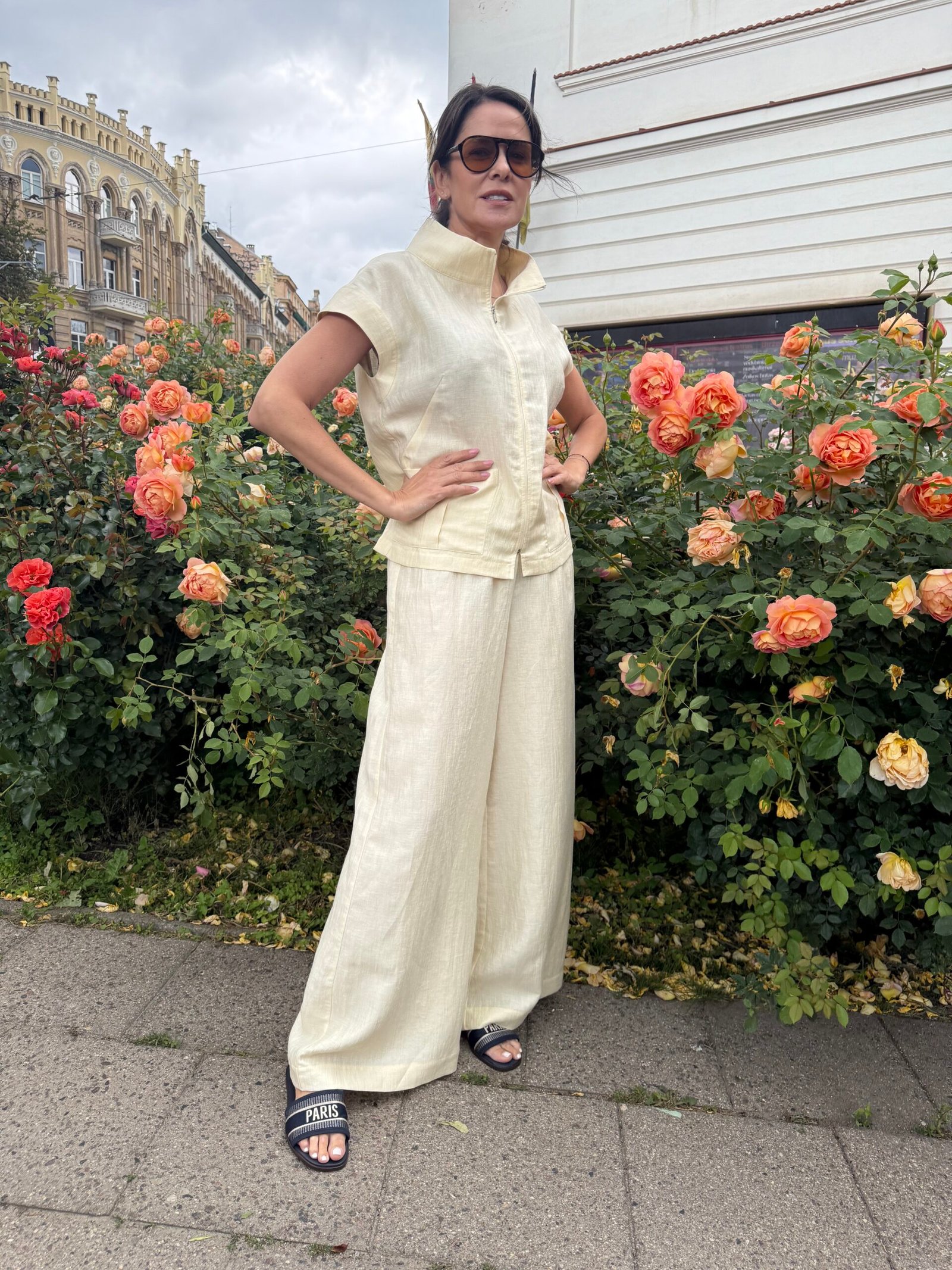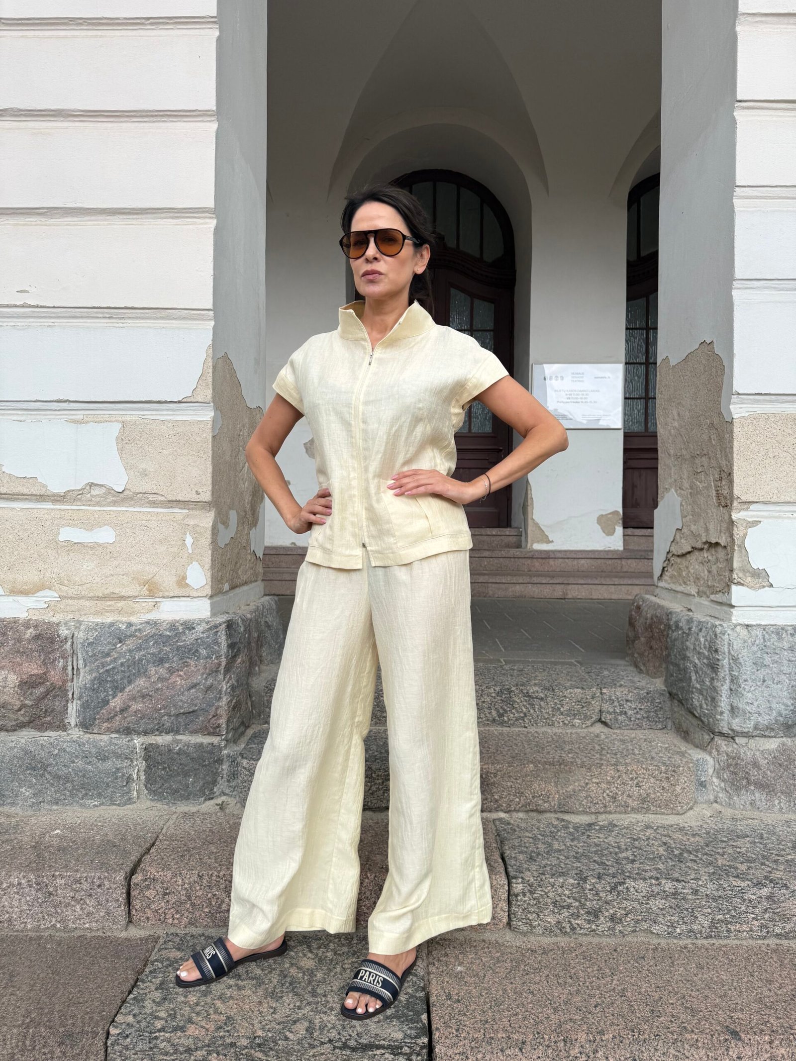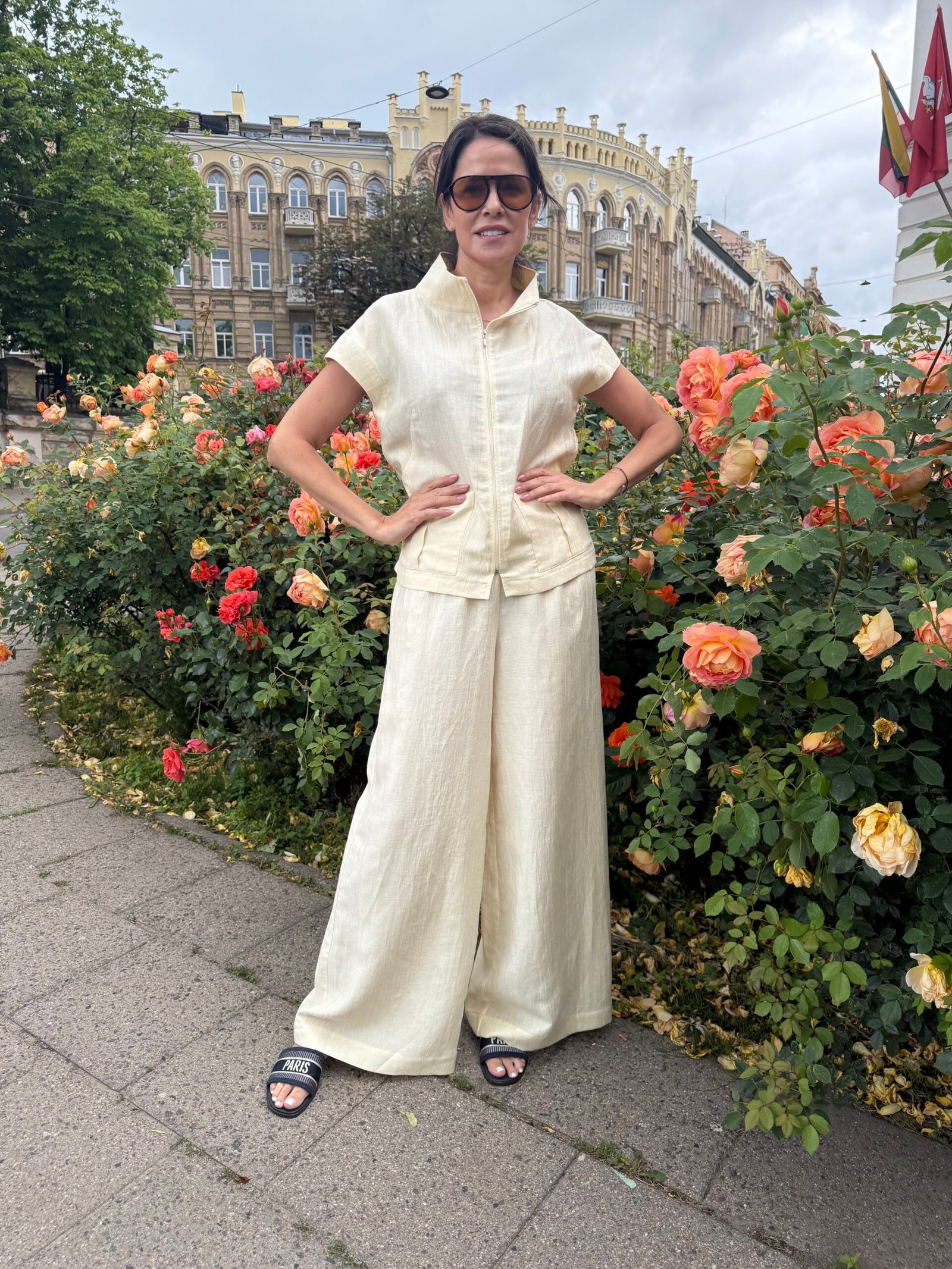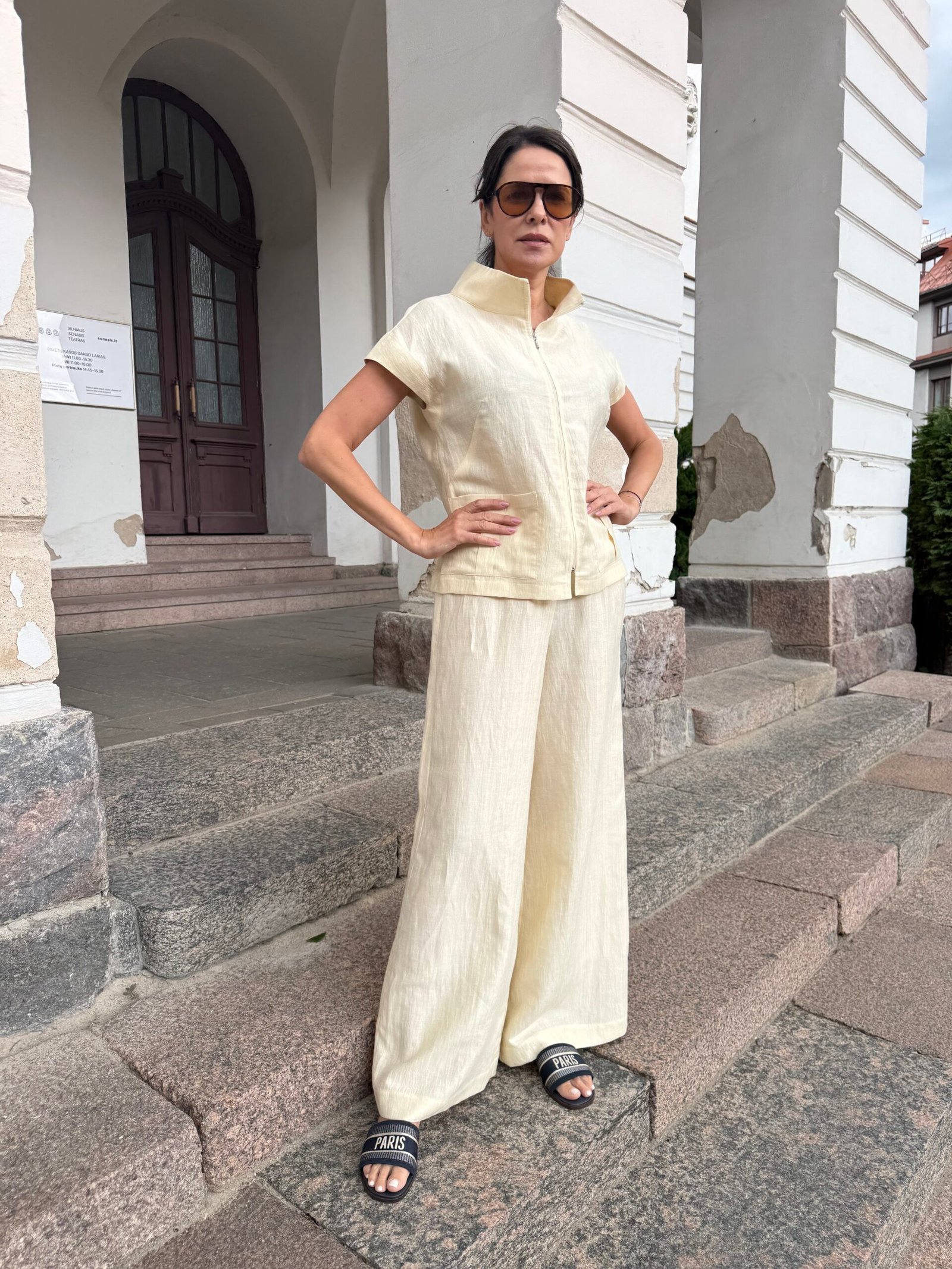 Palaidinė išskirtinė ne tik spalva, bet ir siluetu – lengvai krentanti su užtrauktuku ir stovele, kas suteikia žaismingumo. Audinys pagamintas iš lino ir tencelio derinio, kas suteikia ne tik subtilaus žvilgumo, bet ir leidžia odai kvėpuoti. Puikiai dera su tos pačios spalvos kelnėms ir leidžia sukurti harmoningą, vientisą įvaizdį.