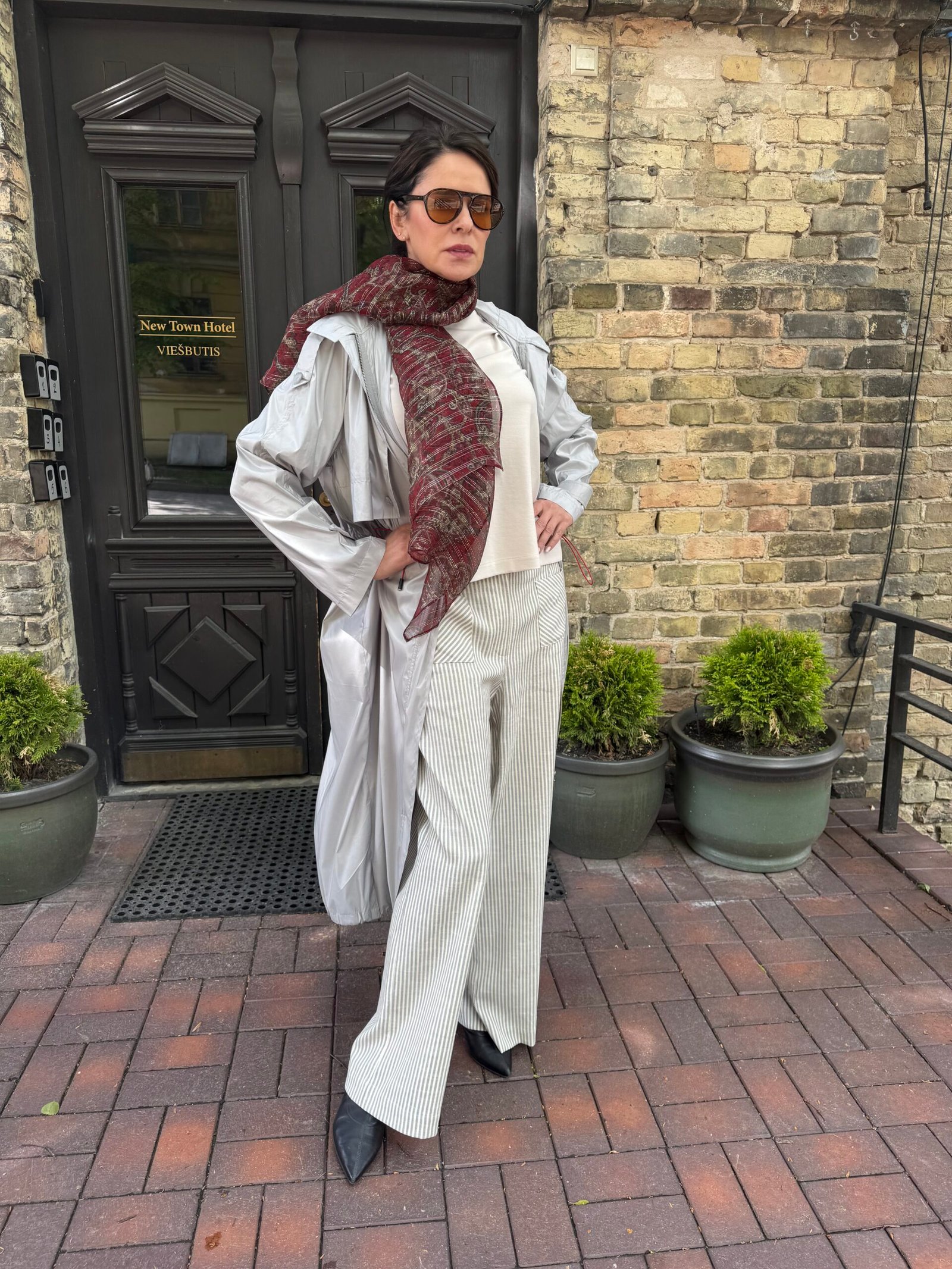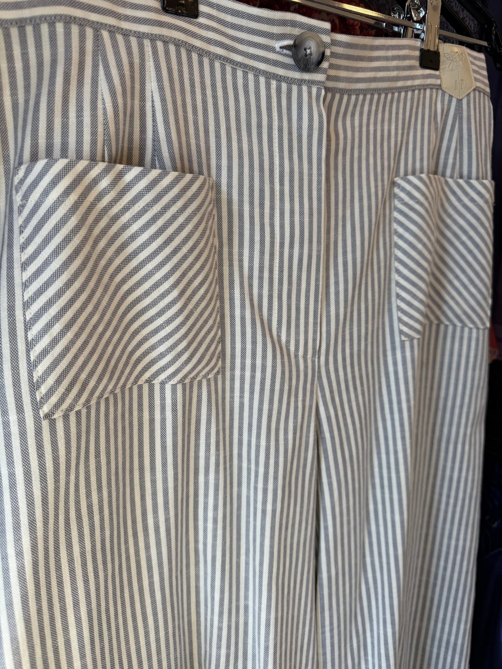 Mūsų dryžuotos lino kelnės su kišenėmis – subtilaus, neerzinančio dryžio su pilku atspalviu.