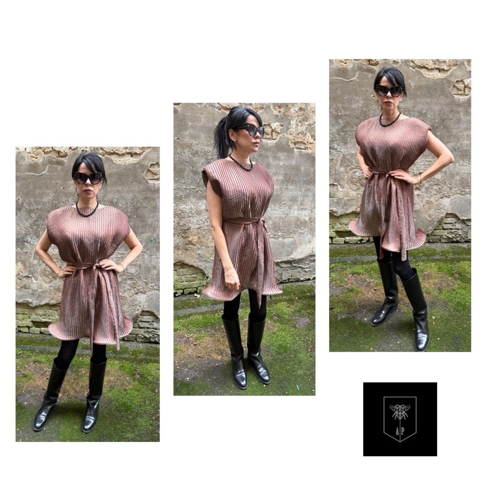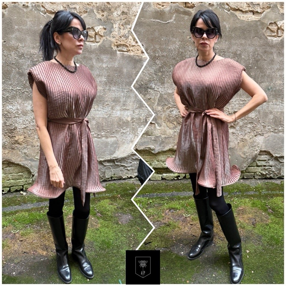 Suknelę galima dėvėti su dirželiu, pabrėžiant liemenį, arba be jo laisvesniam įvaizdžiui.