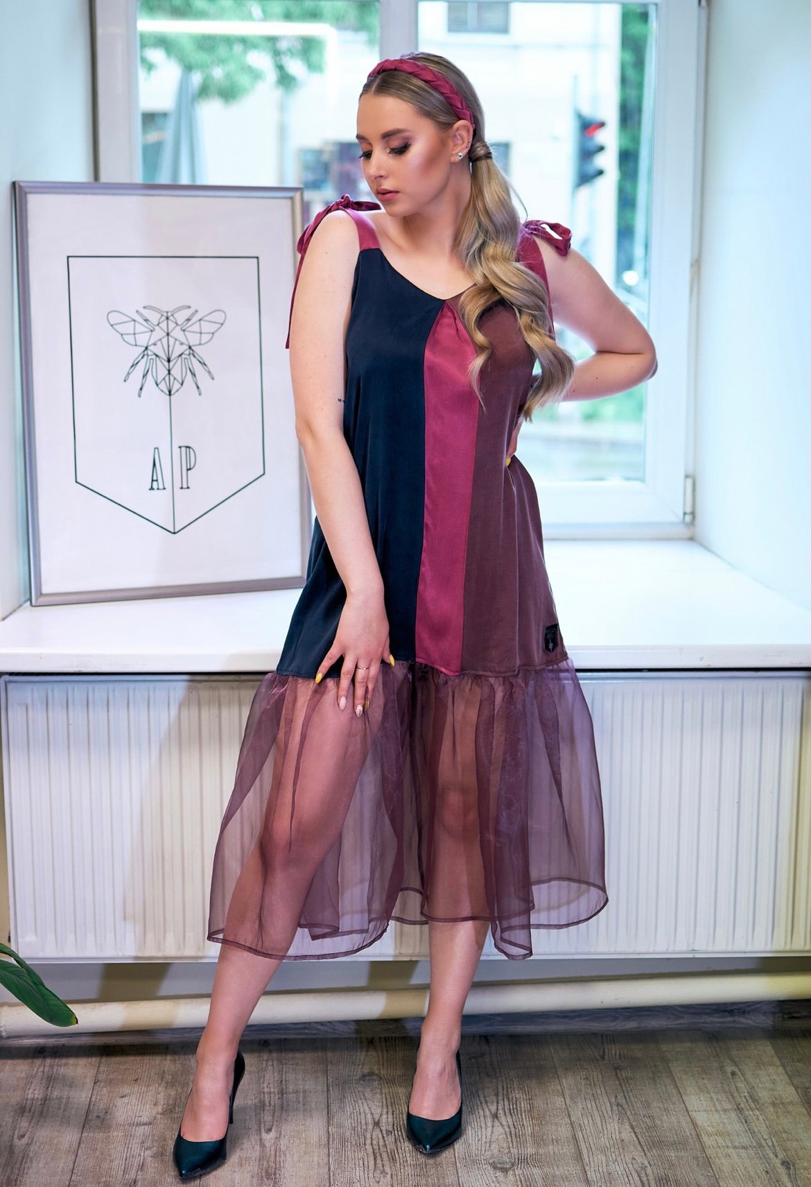 Elegantiška ir subtili – šlapio šilko suknelė alsuoja lengvumu ir rafinuotumu. Natūralus audinys švelniai priglunda prie odos, gražiai krenta ir suteikia komforto pojūtį kiekviename judesyje. Reguliuojamos petnešėlės lengvai pritaikomos prie moters figuros. Subtilūs organzos raukiniai lengvi pridengia kojas, tačiau jų neuždengia pilnai – tai sukuria paslaptingą, lengvą ir įtin moterišką įvaizdį.