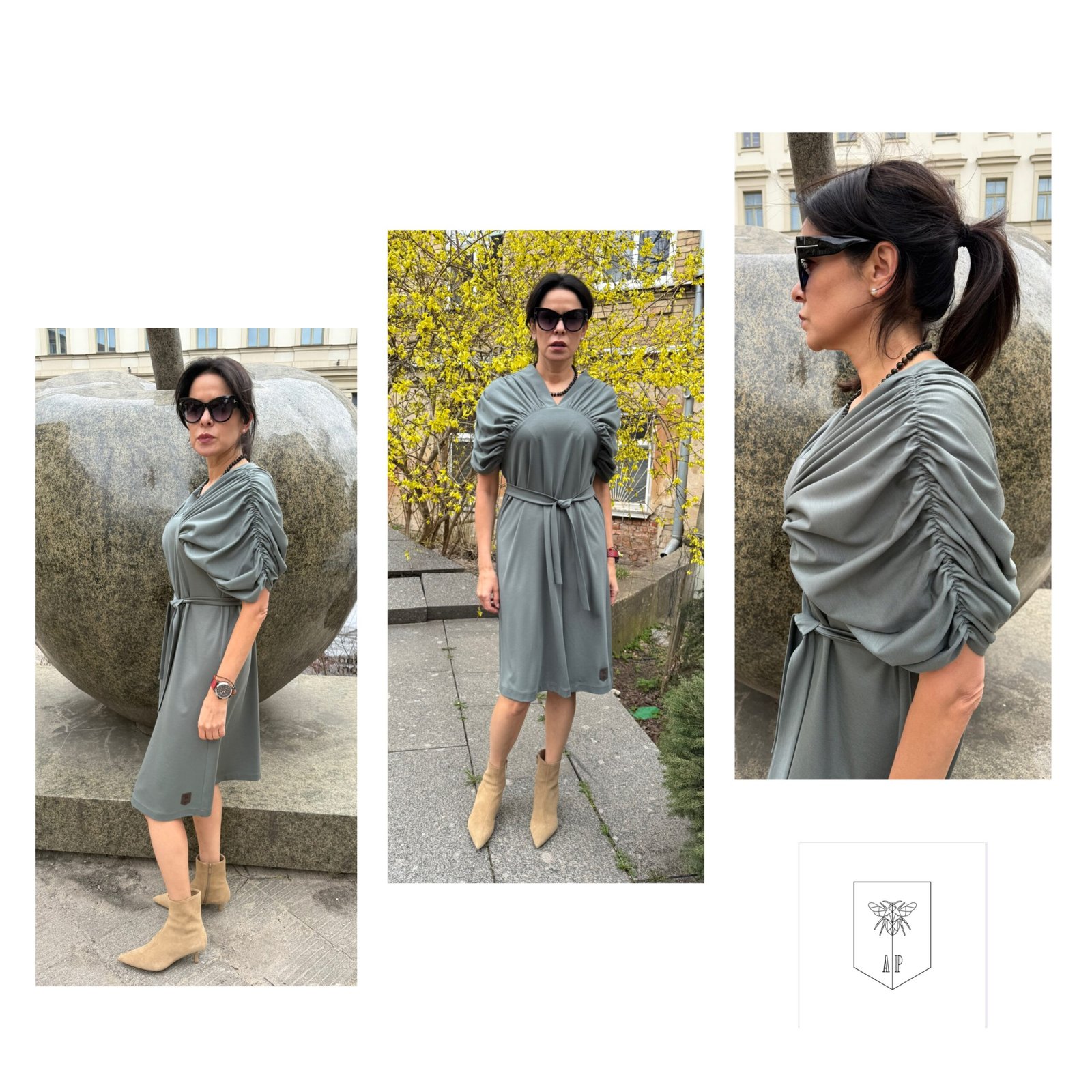 Suknelė klostuotomis rankovėmis, klasikinio ilgio bei silueto – tikra garderobo puošmena.